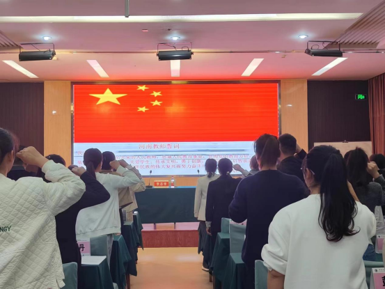 典礼开始,首先举行了庄严肃穆的升旗仪式,学员们庄重地注视国旗、唱国歌。接着,班主任李延方带领大家重温教师誓词,“我志愿做一名光荣的人民教师……爱岗敬业,教书育人,关爱学生”,在教育事业上勤勤恳恳奉献着青春的学员教师们再一次重温了当初选择这个职业的原因。