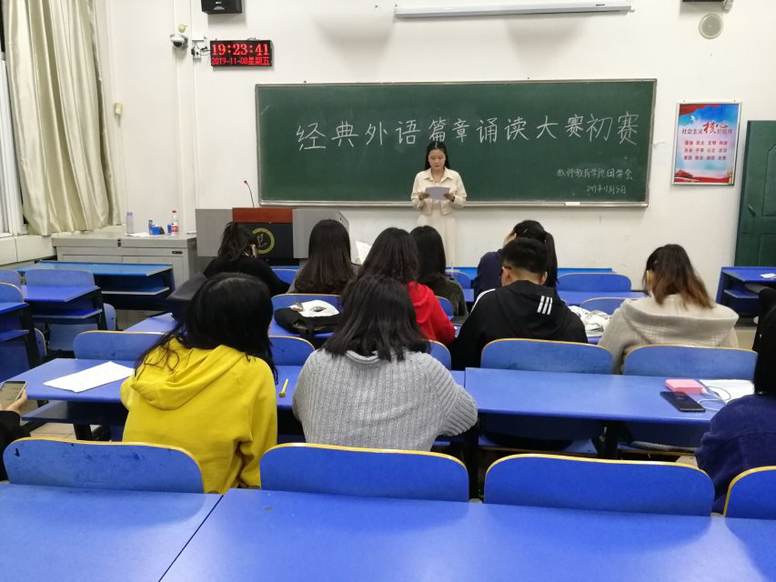 2019年11月8日晚7:00,由beat365唯一官方网站团学会组织的经典外语篇章诵读大赛初赛在1113教室举行。本次比赛的评委有beat365唯一官方网站团学会主席雷雨,部长韩露露、段伟涵和邱雪婷。