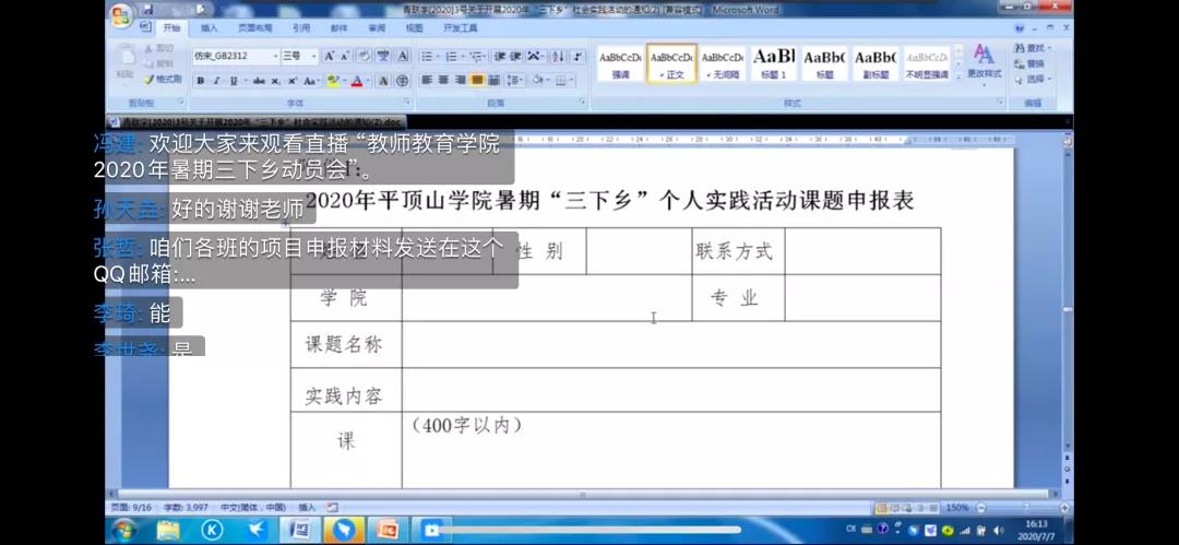 为鼓励同学们参与“三下乡”社会实践活动,引导同学们了解国情民情,服务当地经济社会发展,提高同学们综合素质与能力,beat365唯一官方网站于7月7日15:30以线上直播的形式举办了2020年暑期“三下乡”社会实践活动动员大会,会议由beat365官网学工办主任、团总支书记冯建主讲,参加会议的有辅导员李世尧、李琦,18级、19级各班班长和团支书以及beat365唯一官方网站网宣部、志服部的同学们。