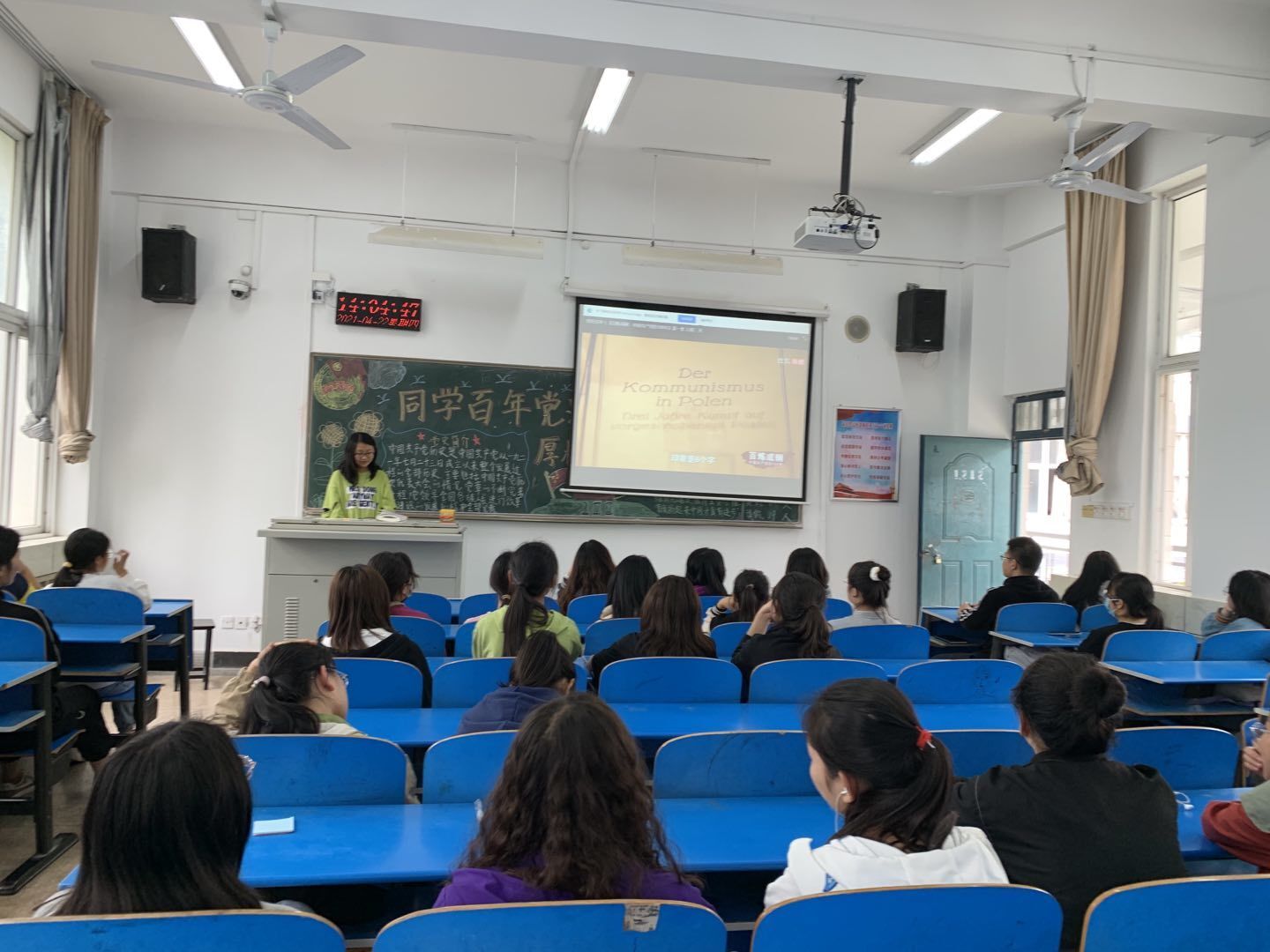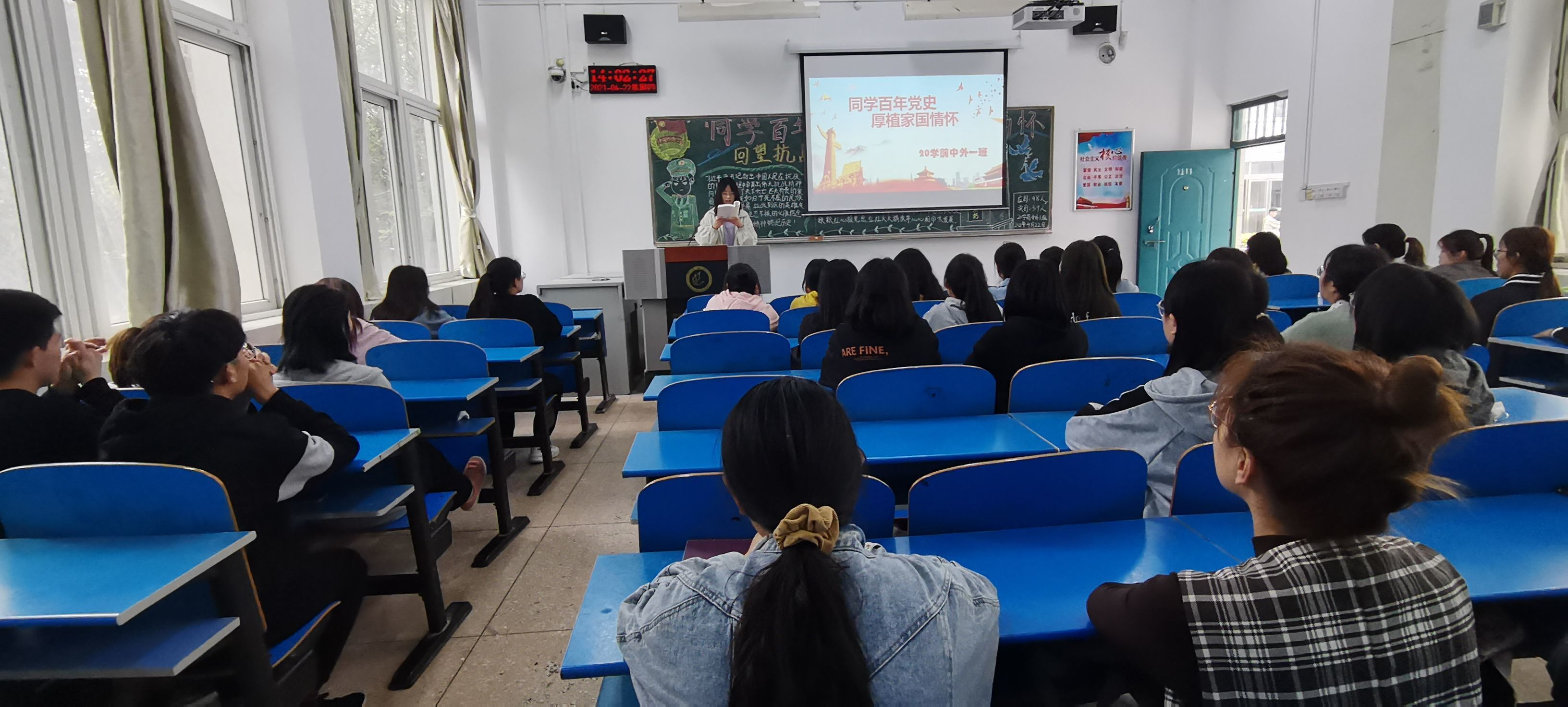 本次团日活动分为以下三个部分:第一部分是“党史在我心”党史学习活动”,第二部分是“党史我来讲”主题班会,第三部分是献礼建党百年---电影展活动。在活动过程中,同学们积极配合、热情参与,深入理解党百年奋斗的光辉历程,有更高的思想觉悟。活动接近尾声,主讲人对本次活动进行总结。