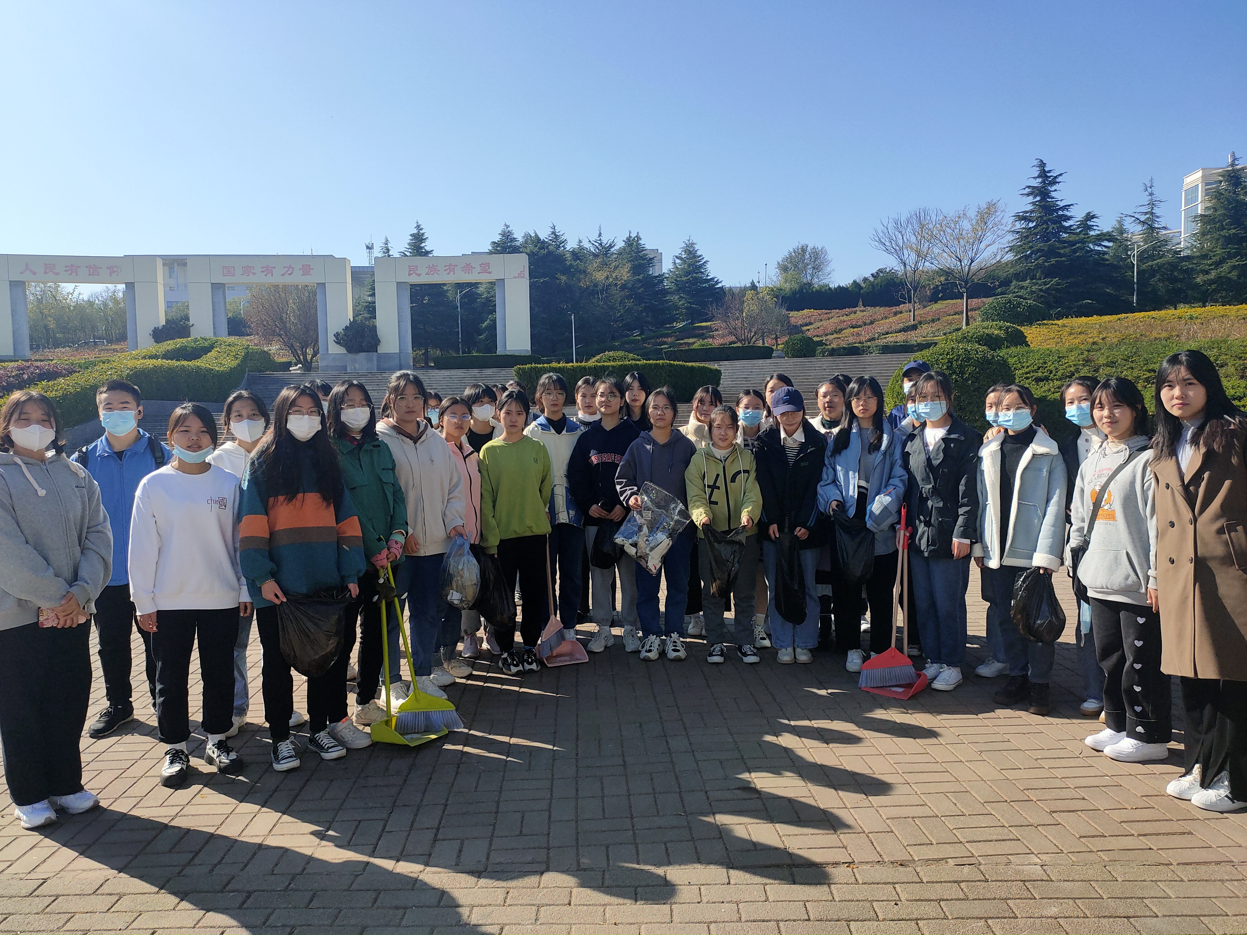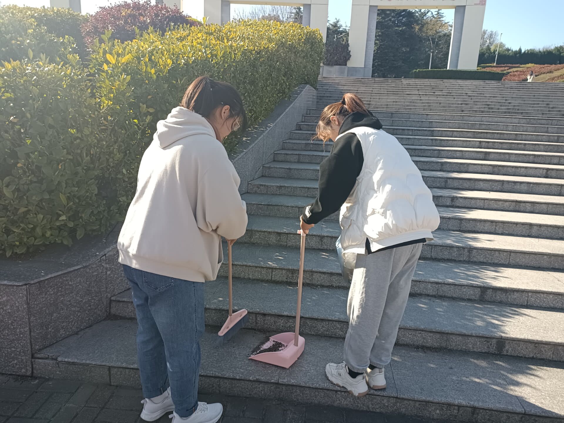 活动开始,负责人组织志愿者在扇形广场集合,并按计划分配清扫区域。清扫过程中,志愿者们干劲十足,认真的清扫地面落叶、阶梯死角、废片垃圾等,不怕苦、不怕累,充分发扬了勤劳奋斗的志愿者精神,清扫活动取得了较好的效果。最后,志愿者们合影留念,本次志愿活动顺利结束。