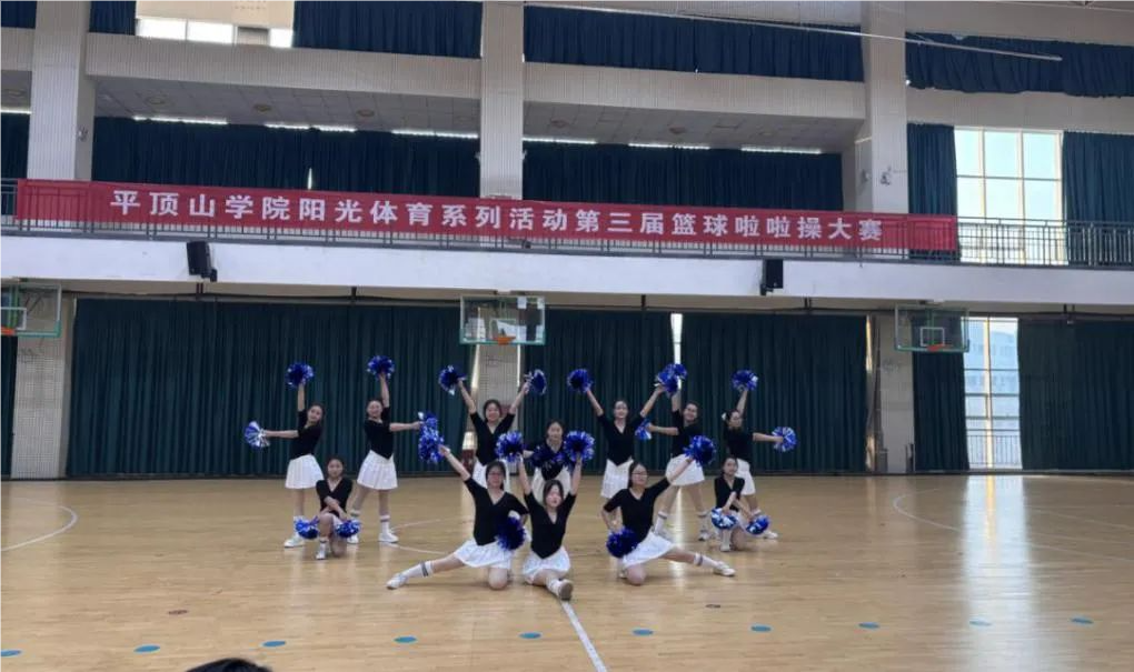 比赛现场,beat365官网队员身着统一的黑上衣、白短裙,手持蓝色彩球,伴随《快乐崇拜》的动感旋律,以整齐划一的踢腿、舒展有力的手臂动作开场,灵动的步伐与明快的节奏完美契合;队形变换间,她们时而舒展肢体展现蓬勃朝气,时而以层次分明的造型定格青春姿态,每一个动作都洋溢着活力与热情,将啦啦操的动感与感染力诠释得淋漓尽致,赛场氛围被瞬间点燃。