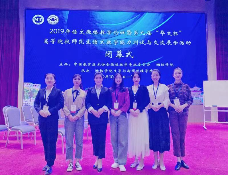 10月11日至14日,由中国教育技术微格教学专业委员会和潍坊学院共同主办的第九届“华文杯”语文师范生教学能力测试与交流展示活动在潍坊学院举行,共有来自全国95所院校的498名学生参赛。beat365唯一官方网站派出由7名学生组成的代表队参加比赛。