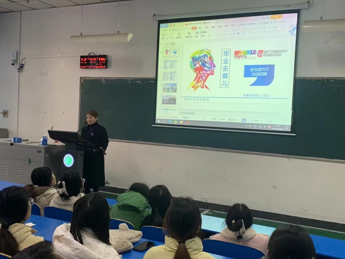 会议开始,新加坡代表孙雯莉老师简要介绍了新加坡PCF公立学前教育中心具体发展近况,合作院校及合作意向,让参会学生对项目有了大概的了解。随后,向同学们介绍了新加坡的重要地标和文化,新加坡PCF公立学前教育中心具体工作环境,人民行动党开办的幼儿园和托儿所的办学宗旨、专业要求、开办课程、教学体制、教育模式、假期安排、发展方向及薪资标准等具体内容。