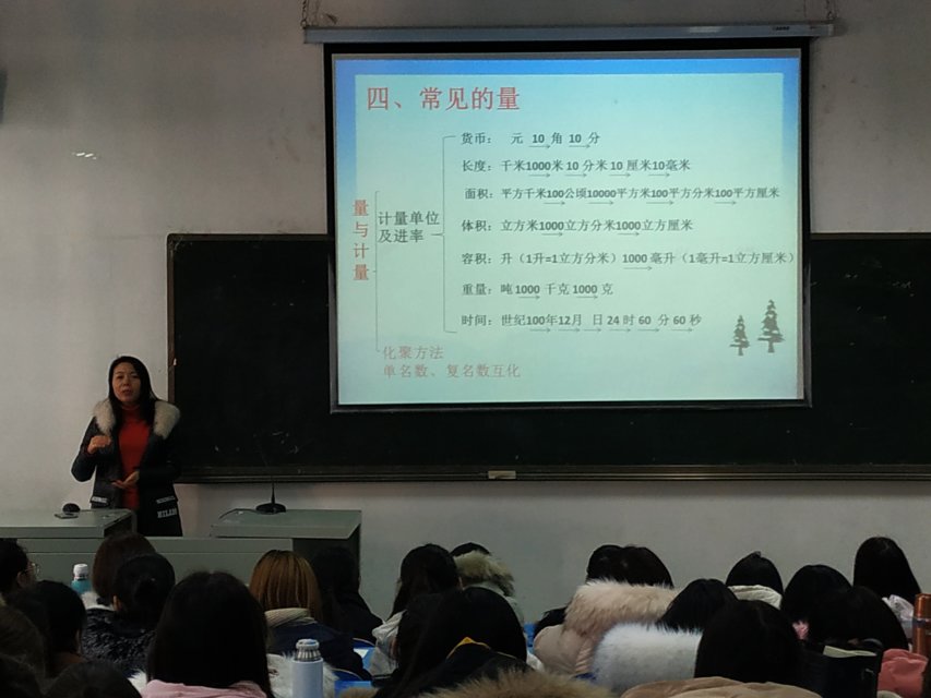 李老师以幽默风趣的语言向在座的学生讲述了关于小学数学“数与代数”领域的知识结构,传授学生课堂上的“五大讲课方法”:情境引入、讲授新课、巩固练习、回归总结看书质疑等五种方法以一种情景模拟的方式现场进行讲授获得学生的喜爱。同时,李老师还结合自己在实践教学中经验,让学生们知道作为一名教师,在着装方面要得体,语言肢体方面要注意,还劝诫学生在面对教育方面,要担起自己作为教师的责任。李老师给学生们上了一堂生动而深刻的