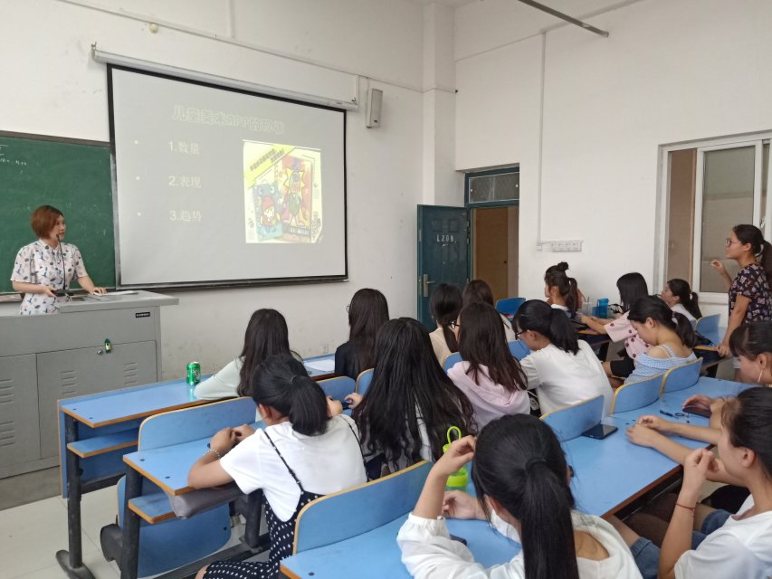 报告开始,李浩老师首先从数量、表现和趋势三个方面为大家分析了当代儿童美术教育类App的现状,并向同学们介绍了几个比较受欢迎的儿童美术教育类App,启发同学们思考这些App受欢迎的原因。同学们认真听讲,与老师积极互动,争相发言,在老师的引导下找出了这些受欢迎的App的共同之处。然后李老师带领同学们分析了不同年龄阶段的儿童美术教育,并向同学们介绍儿童此时的阶段特征。其中儿童的视知觉认识能力,例如空间感知能力对儿童美术教育有着重要的影响。最后借用实例,李浩老师向同学们介绍了如何将儿童美术教育类App应用在课堂教学中。