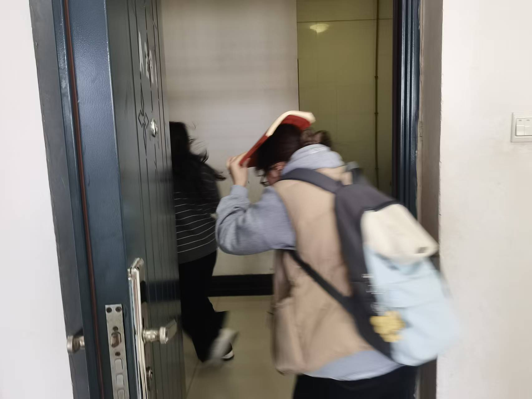 实验室管理员郑朝锋老师先讲解了演练要求,随着急促的模拟警报声响起,演练正式开始。学生迅速采取“伏地、遮挡、手抓牢”的紧急避险动作,就近躲避在紧固的桌椅下方。强震过后,在指挥员的指令引导下,全员快速、规范地从疏散路线有序撤离,期间弯腰捂头、保持安静、护颈防坠物。各出口、楼梯拐角均有安全员引导分流、避免拥挤踩踏。所有人员顺利到达指定位置后,各组清点人数并汇报情况,全程3分钟,高效完成疏散目标。