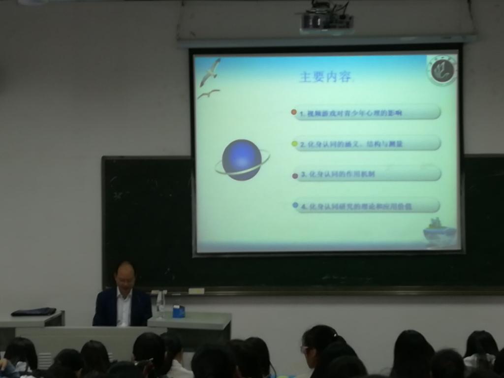 报告伊始,李老师展示了一些游戏的图片,询问在场的学生是否玩过这些游戏。进而通过举例的方式,从视频游戏对青少年心理的影响、化身认同的涵义、化身认同的结构与测量、化身认同的作用机制、化身认同研究的理论和应用价值等五个方面展开论述。他强调,随着信息化时代的发展,网络暴力游戏对青少年的心理危害不容忽视,并深度解析了视频游戏对青少年的影响,探索了青少年的真实心理,进而讲述了个人与化身认同的关系、化身认同的影响及自我认同的重要性。学生听讲认真,受益匪浅。