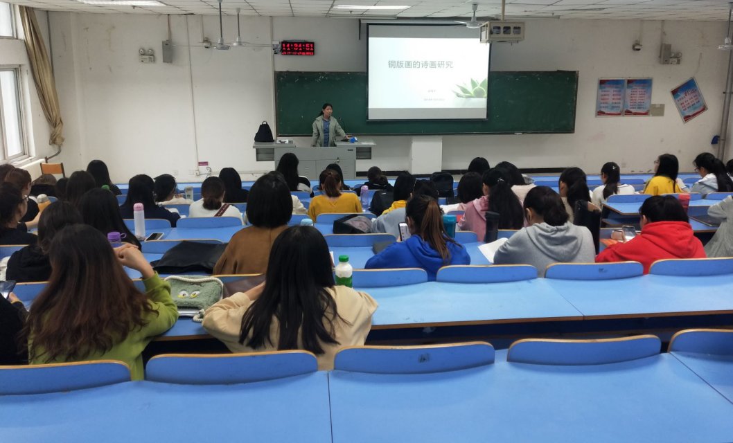 首先,赵瑞平老师借助提问的方式抛砖引玉,激发起学生们对铜版画的兴趣,并为同学们详细地介绍了铜版画。接着,赵老师展示了数位名家作品,并讲述了如线蚀、飞尘、柔汀等铜版画制版技法,结合自己绘制铜版画的亲身经历,使同学们快速深入的掌握了铜版画的技能与制法。报告最后,赵老师凭借自身丰富的教学经验将铜版画研究与学生的专业相结合,巧妙的引导学生深入思考铜版画于当代社会的价值与影响,极大的激发了学生们的研究兴趣。