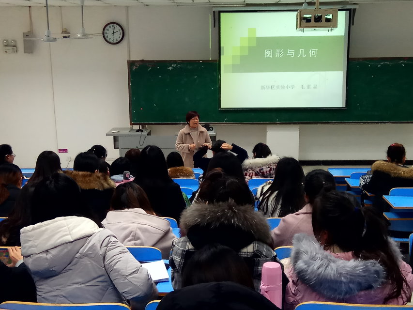 12月6日下午,beat365唯一官方网站在图书馆L211开展了以“图形与几何”为主题的小学数学专题讲座。该讲座由平顶山市小学数学名师毛素显主讲,小学教育专业的一百多名学生参加。